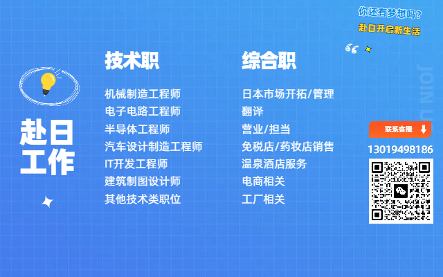 嚴(yán)海赴日(workinjapan.cn)是專業(yè)的赴日工作服務(wù)平臺,是大連嚴(yán)海人力資源有限公司旗下品牌。主要提供日本就職(工作簽)/日本留學(xué)(半工半讀),等最新工作信息和資訊,為想赴日工作的小伙伴們提供專業(yè)的、一對一的咨詢,為您職業(yè)生涯規(guī)劃、永居辦理、在日期間換職、轉(zhuǎn)換簽證等方面提供支援。